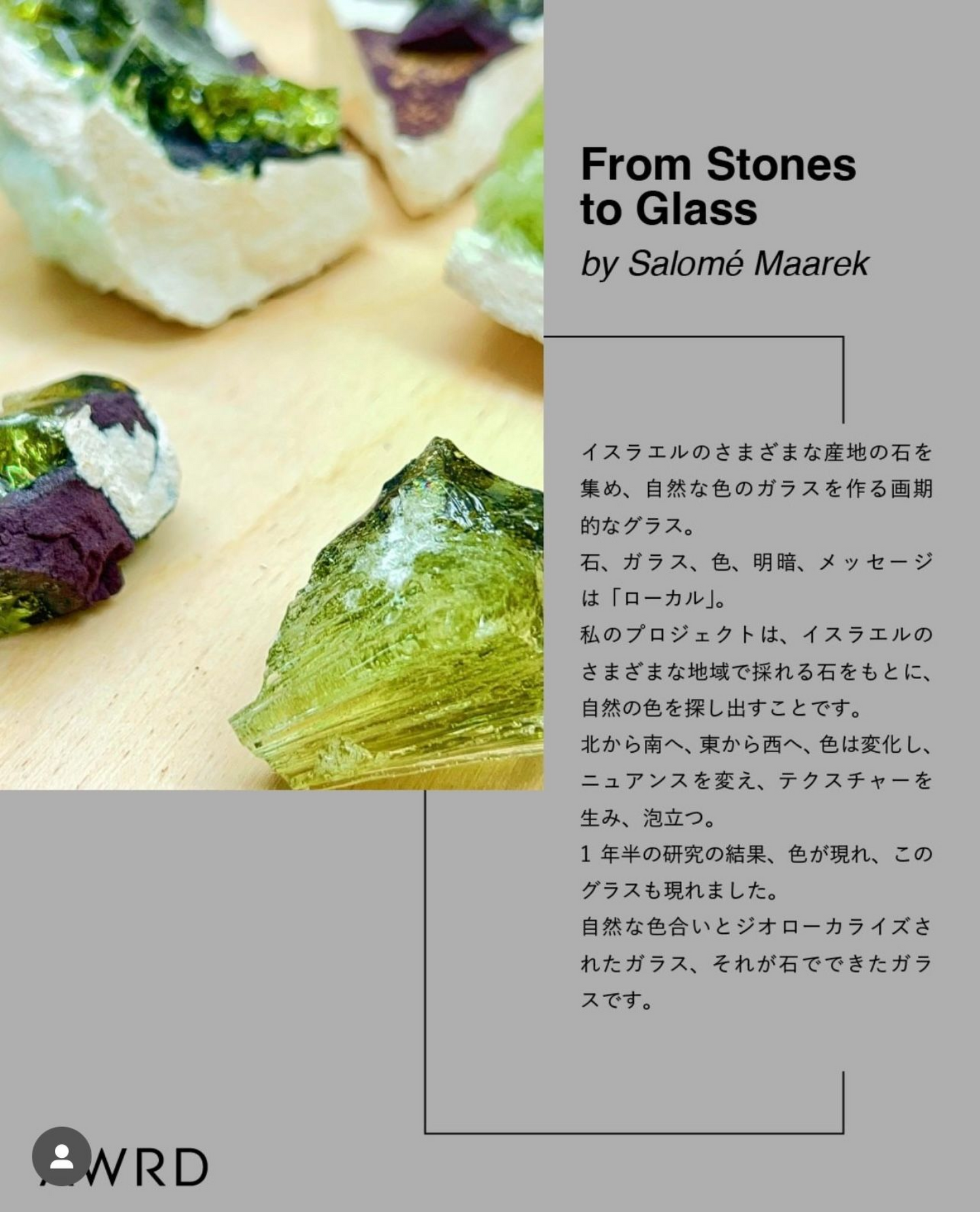 Salomé Maarek, designer visionnaire née à Paris, est diplômée de la prestigieuse École Duperré, Paris et de la Bezalel Academy of Arts and Design de Jérusalem. Reprenant le savoir-faire familial transmis par son grand-père, elle a transformé le domaine de la joaillerie avec une technique révolutionnaire qui colore naturellement le verre avec des roches.